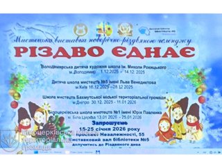 15 січня у виставковій залі бібліотеки №5 відбулося відкриття мистецької виставки новорічно-різдвяного челенджу «Різдво єднає». В експозиції представлено 60 робіт юних митців із шести міст України: Володимира, Бахмута, Києва, Білої Церкви, Дніпра та Костянтинівки.